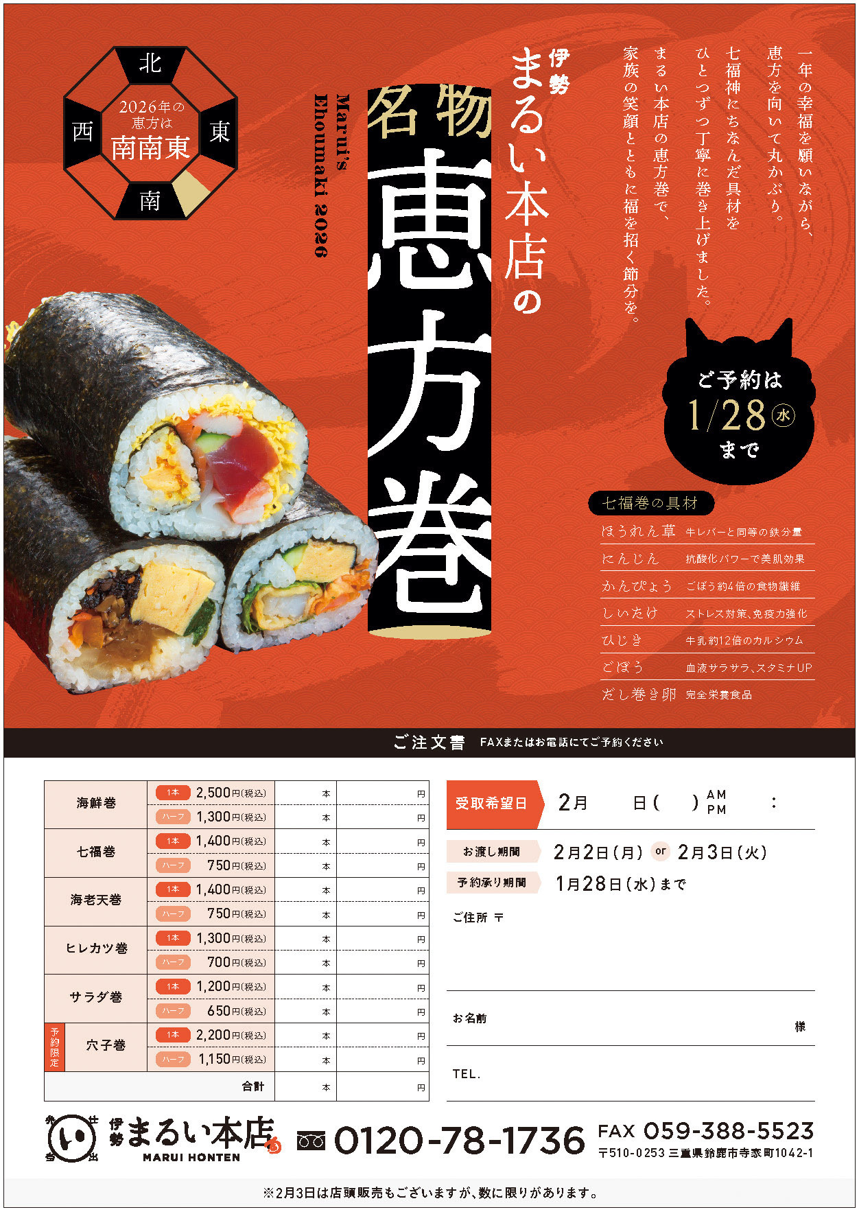 2026年 まるい本店の恵方巻!今年は南南東!