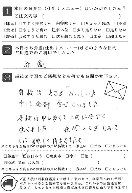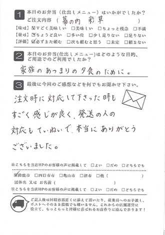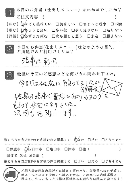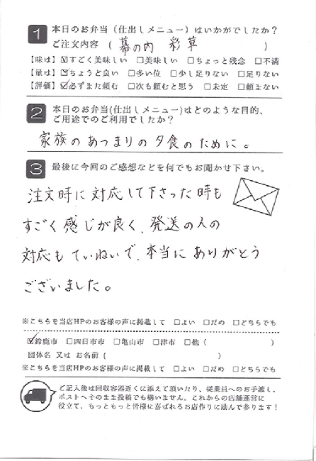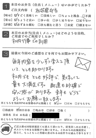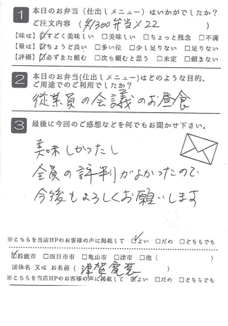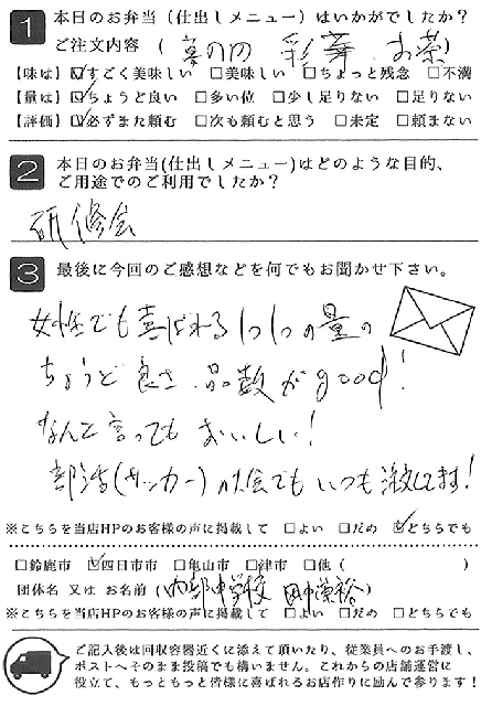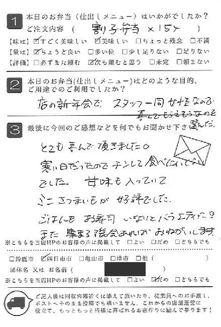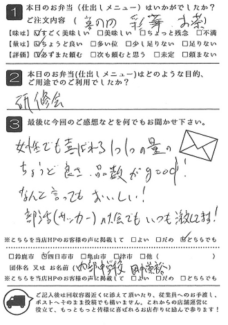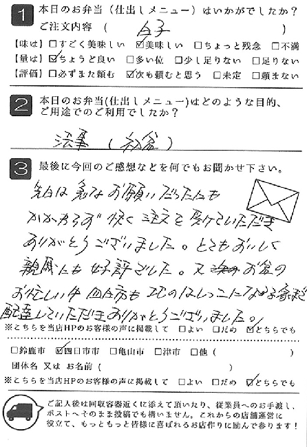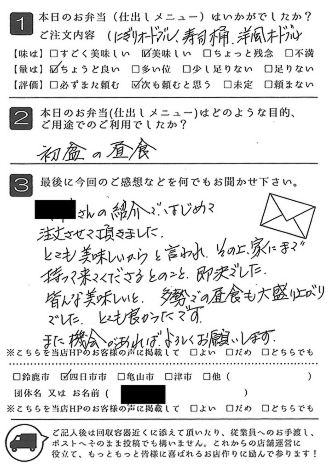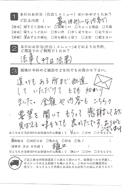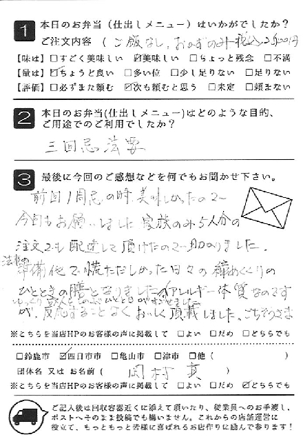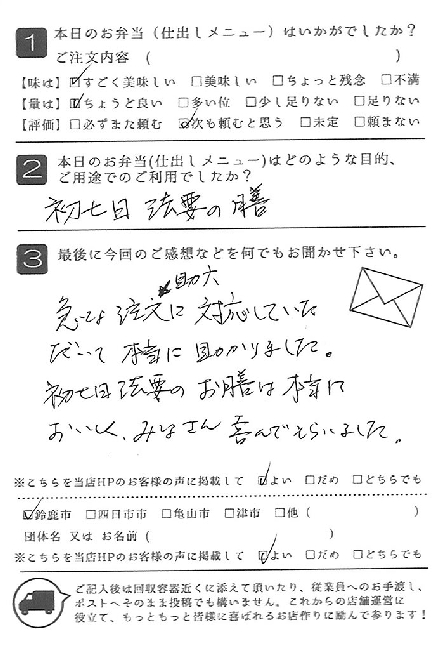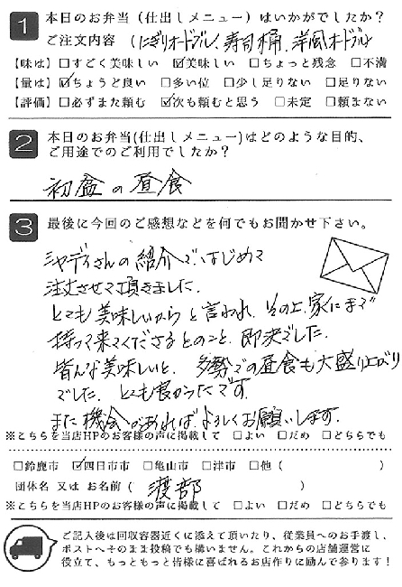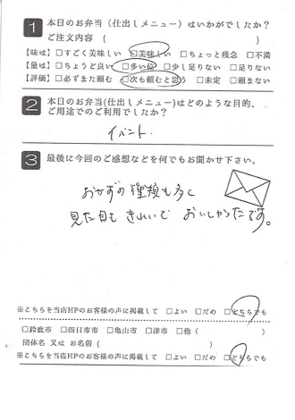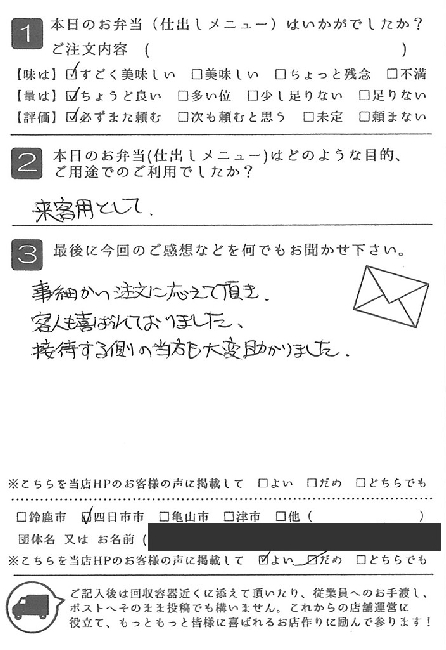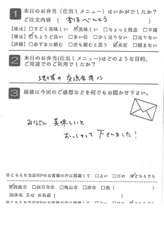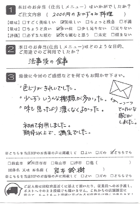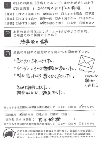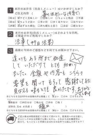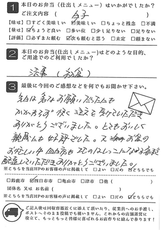 お弁当も皆さんに喜ばれました。また利用させていただきたいと思います。